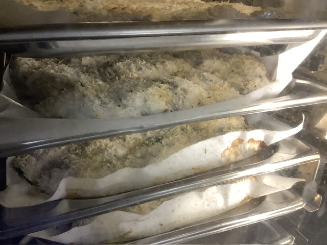 山口水産から新鮮なしいらが届きました。給食室手作りの豆乳マヨネーズとしいらを絡ませ、パン粉をまぶしたらスチームコンベクションで焼き上げます。マヨネーズからでる油分がパン粉に染み込み、カリッと焼き上がりました。