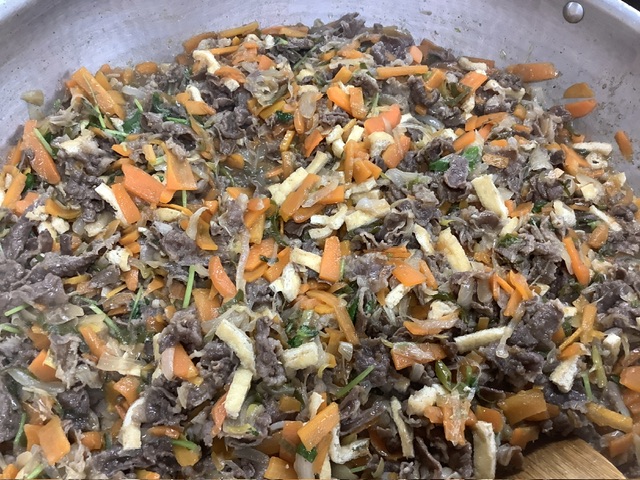 具材は牛肉・35ファームのにんじん・玉ねぎ・深ねぎ・油揚げ・三つ葉を炒めて、きび糖や味の母、醤油で甘辛く味付けしています。