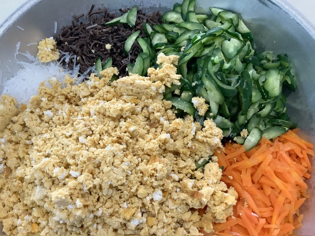 きゅうり・にんじん・炒り卵・きくらげが入った春雨の酢の物です。