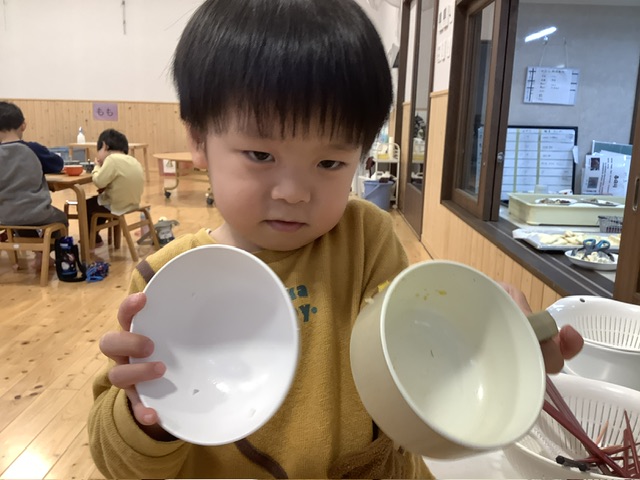 配膳を通して自分の食べきれる量を知ったり、自分で配膳して運ぶ中で少しこぼしたりなど、さまざまな成功や失敗を経験することでこども達は成長しています!