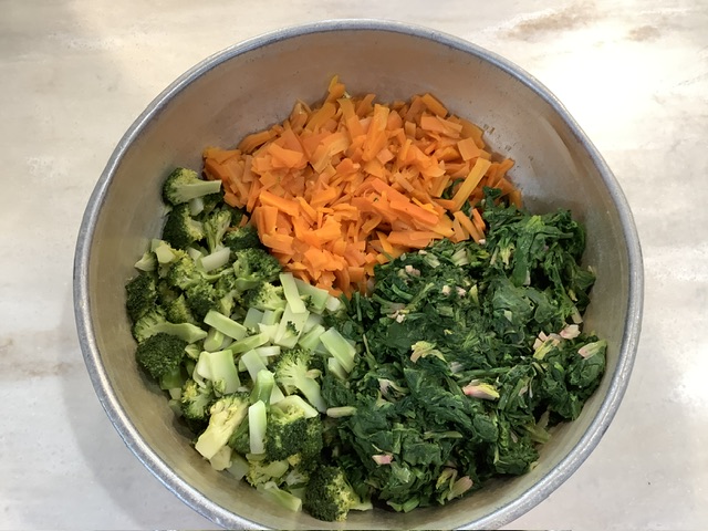 35ファームのほうれん草と人参、ブロッコリーをスチームにかけて、ひよこ豆ドレッシングで和えて提供しました。