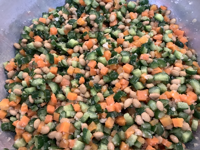 フードカッターにかけた大根、圧力鍋で下でつぶせる固さまで炊いた大豆と、コロコロに切ったきゅうり、35ファームの人参が入りました。