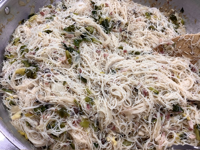 寿草から仕入れた玄米ビーフン、南州農場のベーコン、玉ねぎ、キャベツ、えのきたけ、椎茸が入った具沢山の五目ビーフンです。本日使用したキャベツは、のはら園で収穫しました。