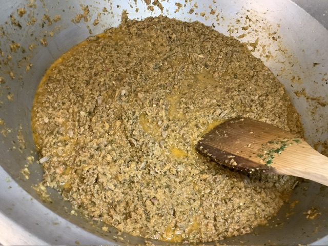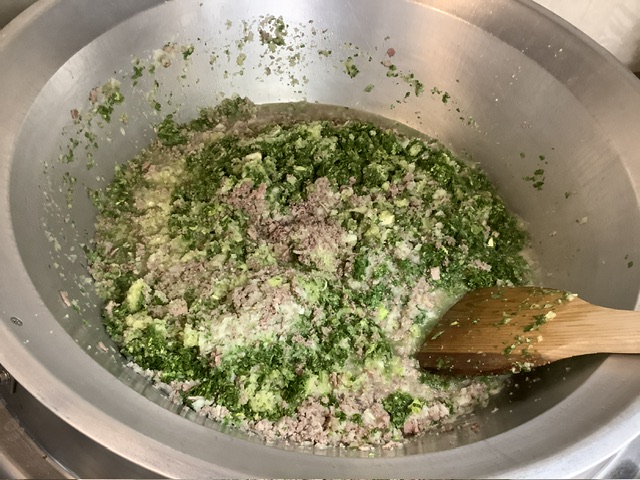 一真の合挽肉、玉ねぎ、にんにく、南州農場のウインナーとベーコン、トマト缶、エバミルク、粉チーズが入ります。セロリは6キロ使いました。セロリは葉ごとミキサーにかけ全て使いますよ。