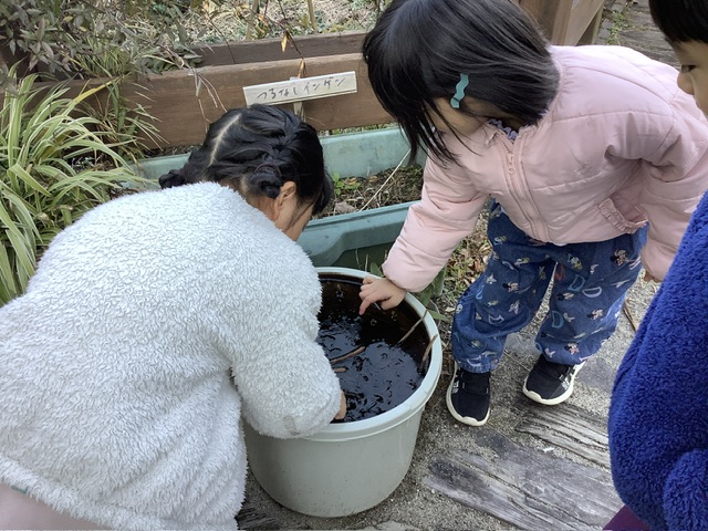 気温がぐっと低くなっていた今日、のはら園に向かう途中にはバケツに張った氷や霜柱が…