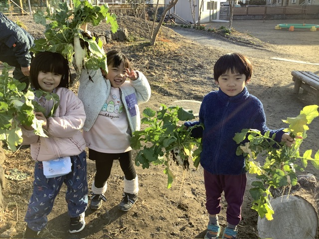 のはら園では今日のみそ汁で使用する野菜に加えて、大きな葉付きの大根も収穫しました。