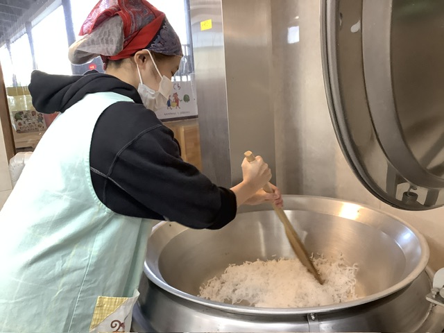 今日はゆり組の担任が給食室に!大きな回転釜で、全身を使って混ぜていきます。