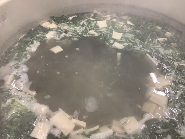 高野豆腐・しめじ・水菜・春菊が入ったみそ汁です。