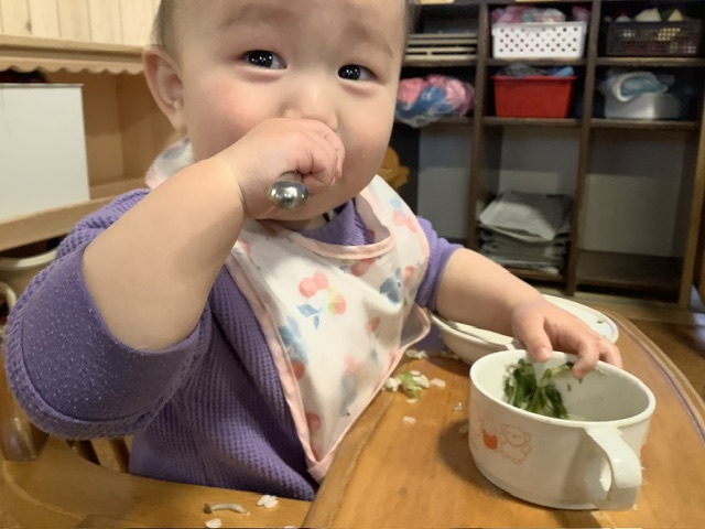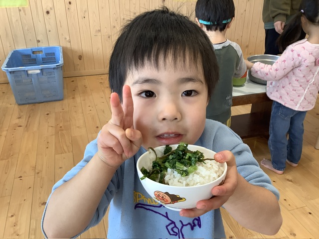 さくら組のこども達が収穫してくれた大根葉は、塩昆布と一緒に炒めて各クラスに振る舞いました!