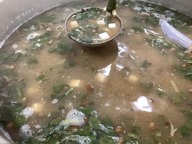 なめこ、絹ごし豆腐、ほうれん草が入り、赤味噌で仕上げました。