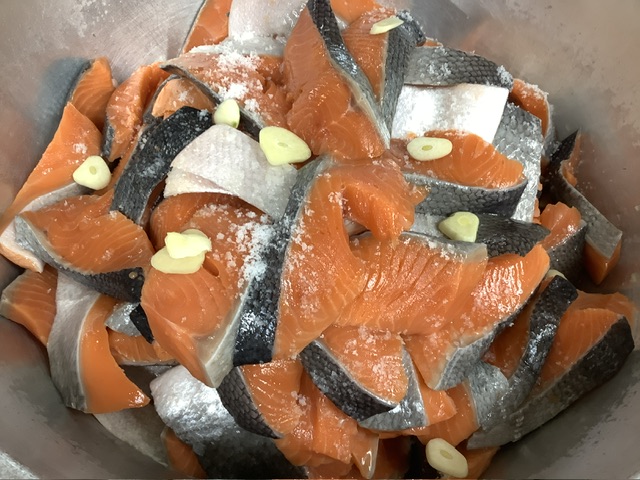 鮭に塩こしょうで下味をつけ、にんにくと橙果汁と一緒に漬け込み、オリーブオイルをかけて焼き上げました。普段、鮭のにんにく焼きではレモン果汁を使用しますが、今回は橙の果汁を使ってアレンジをしました。