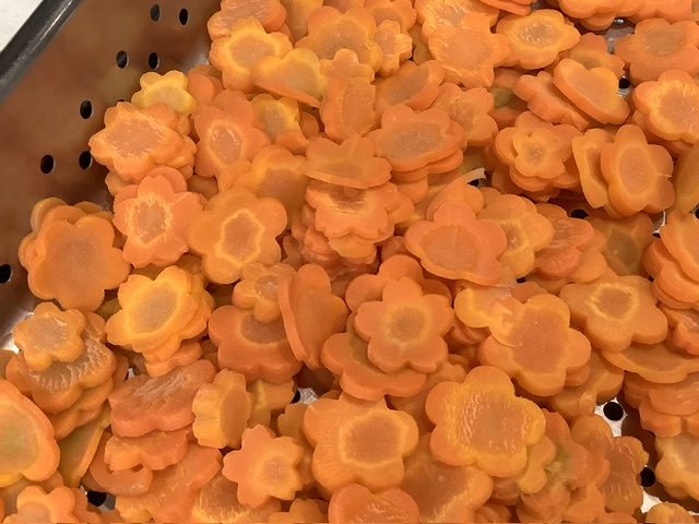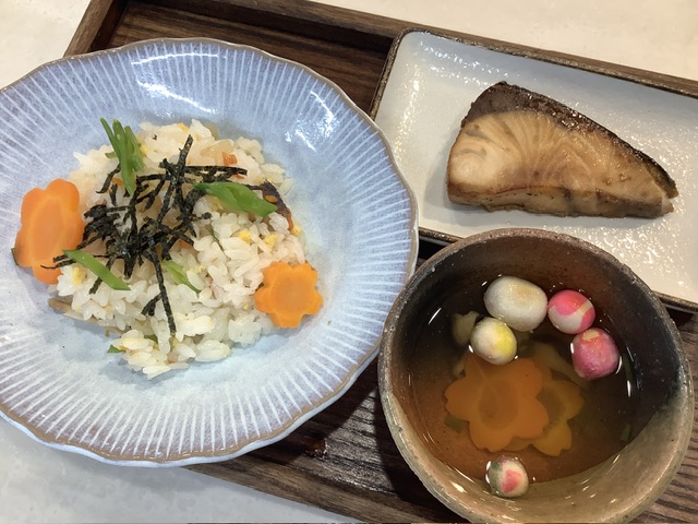 色とりどりの鞠麩が入ったすまし汁に、こども達も大喜び。花型人参も入り、色鮮やかなすまし汁に仕上がりました。