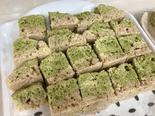 おやつはひなあられでしたが、3歳未満児は誤嚥防止のため、蒸しパンを作りました。いちごジャムのピンクと、抹茶の緑で二層にしてみました。