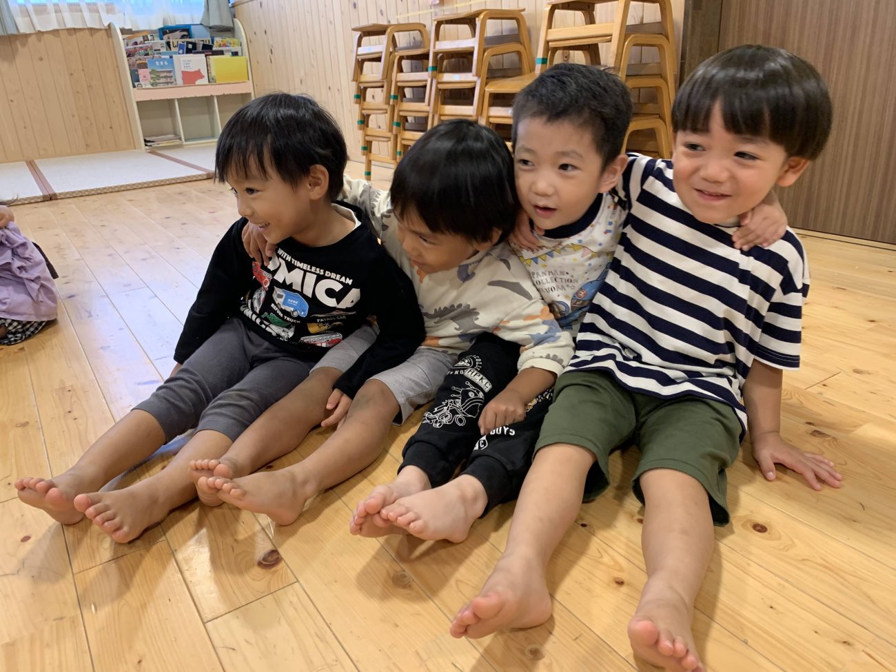 きく組に進級して、1年が経とうとしています。進級したばかりの頃は、部屋が違ったりいつもと違う大人だったりと環境の変化に戸惑う姿もありましたが、今では自分で考えて行動するとても頼もしいお兄さん・お姉さんとなりました。