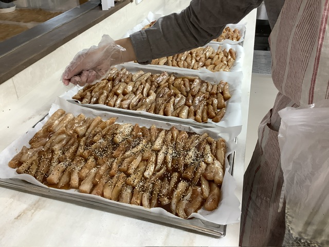 すりおろし生姜を加えた調味料に漬け込み、白と黒のごまをふりかけオーブンで焼き上げました。