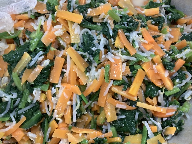 もやし、ほうれん草、人参をスチームにかけて、だいだいを使った酢味噌で和えました。