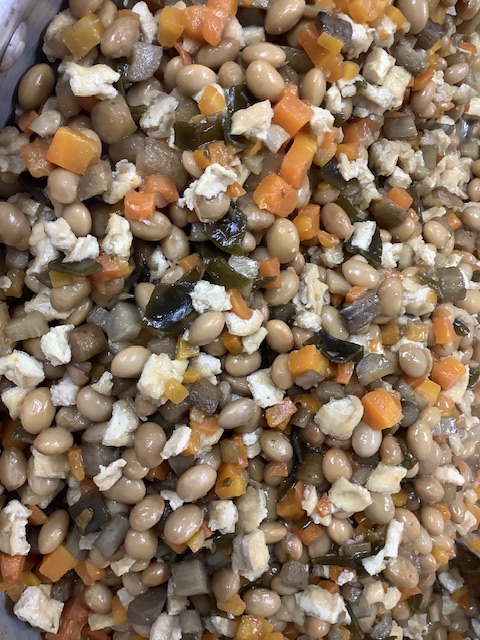 錦ヶ丘の人気メニュー五目豆。大豆は、圧力鍋で歯茎で潰せる硬さになるまで炊いています。