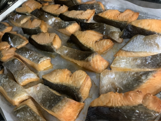 山口水産から届いた新鮮な鮭に、塩こしょうをふり焼きます。きび糖、薄口醤油、酢で甘酢を作り、上からかけたら出来上がりです。