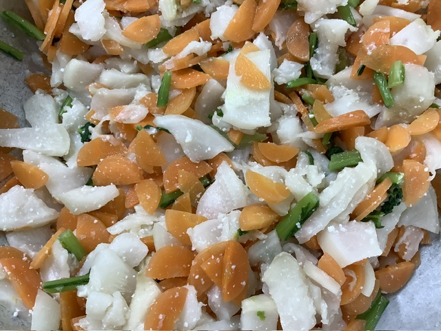 かぶ・35ファームのにんじんをスチームで加熱し、塩麹で和えました。火を加えたかぶは、トロトロと柔らかい食感になり、塩麹と組み合わせることで野菜の甘みも引き立つ美味しい麹和えに仕上がりました。
