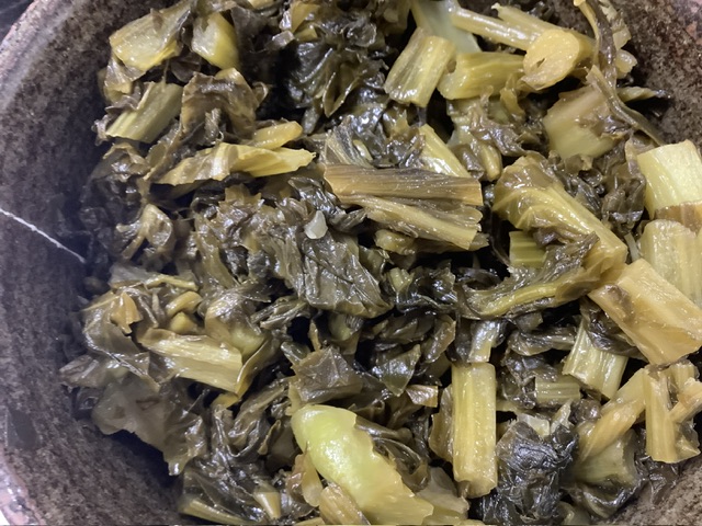 みそ汁にも取り入れたこぶ高菜は、ごま油で炒めて薄口醤油・きび糖・味の母・酢で高菜漬け風の味付けをしました。