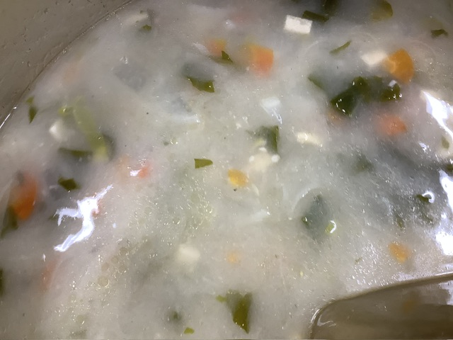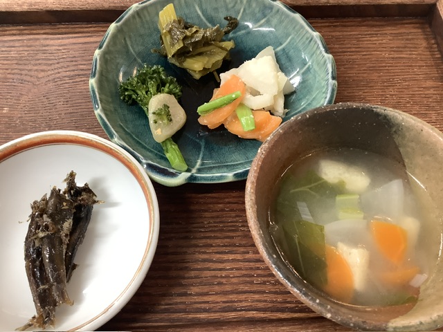 35ファームのにんじん、深ねぎ、大根、のはら園で収穫した「こぶ高菜」、油揚げが入った具沢山のみそ汁です。「こぶ高菜」は名前の通り高菜の一種で、茎の部分に大きなこぶができることが特徴です。葉の柔らかいこぶ高菜をはじめ、野菜の旨みが溶け出たみそ汁になりました。