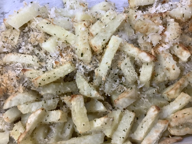じゃがいもをスティック状に切り、塩胡椒、パン粉とパセリ、最後にオリーブオイルをまぶして高温でカリッと焼き上げます。ポテトフライのような、みんな大好きな味です。