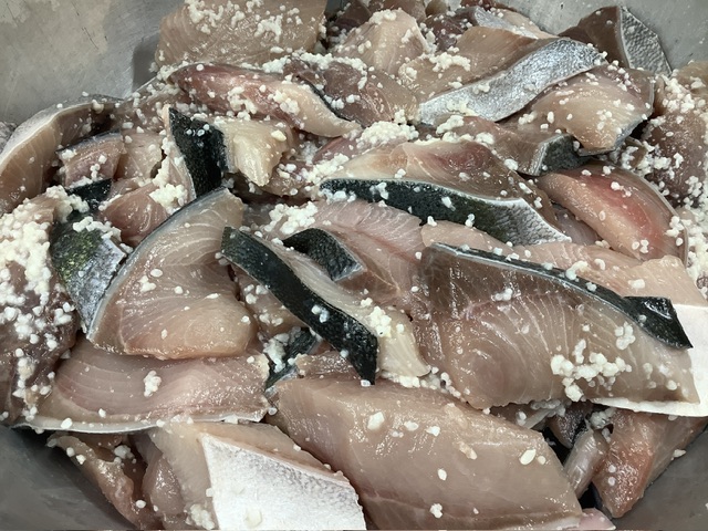 山口水産から届いたぶりを、給食室手作りの塩麹に漬け込んでオーブンで焼き上げました。