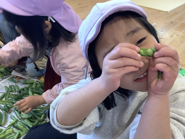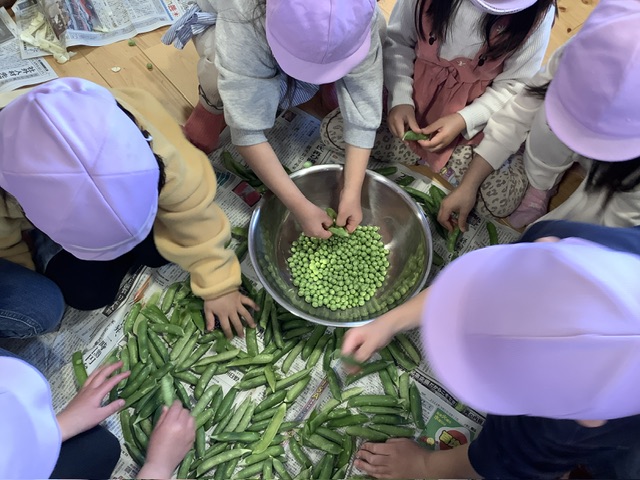 今月は「そらまめくんのベッド」との絵本コラボの一環で、こども達にグリンピースのさや剥き・たけのこの皮むきをしてもらいました。