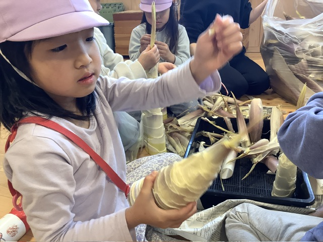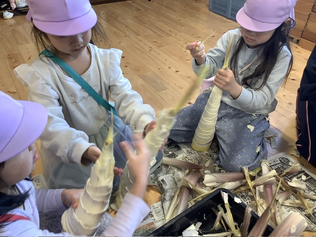 また、たけのこの皮むきでは「これどこまで剥くの?」「毛が生えてるみたい」「たけのこご飯が食べたいよ〜」とそれぞれの感想を教えてくれました。