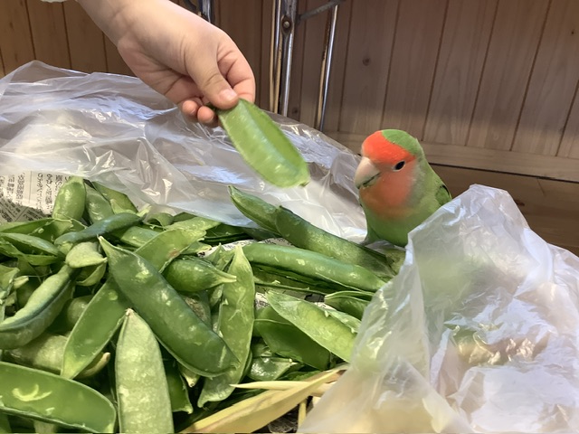 最後に片付けをしていると、剥いた後のさやをじーっと見つめるぴーくんの姿が!🦜