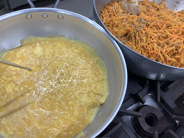 給食室の調理のポイントとして、炒り卵は別鍋で作ってから人参を炒めている鍋に後入れします。