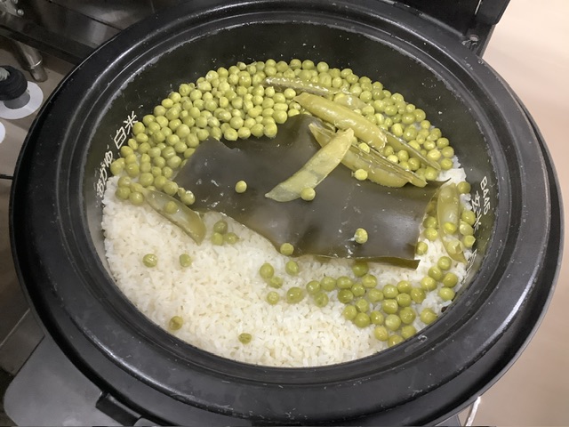 いつもの五分づき米に今が旬のグリンピースを混ぜて、昆布・塩・酒と一緒に炊いています。