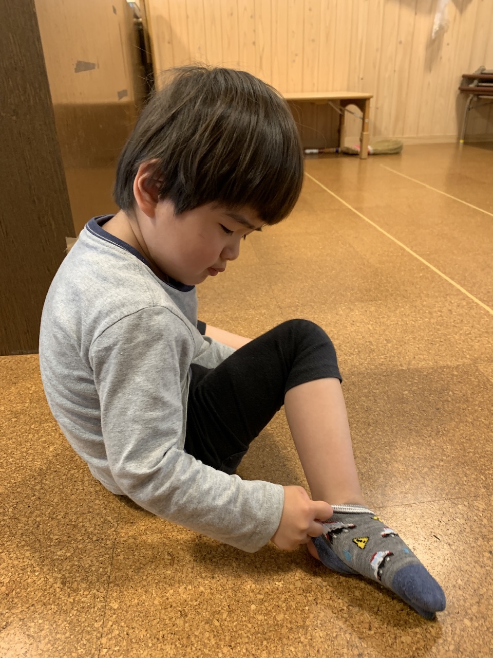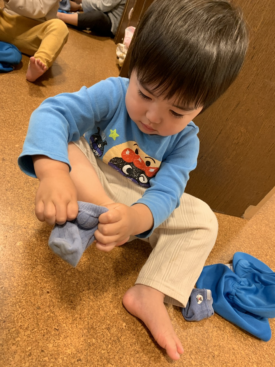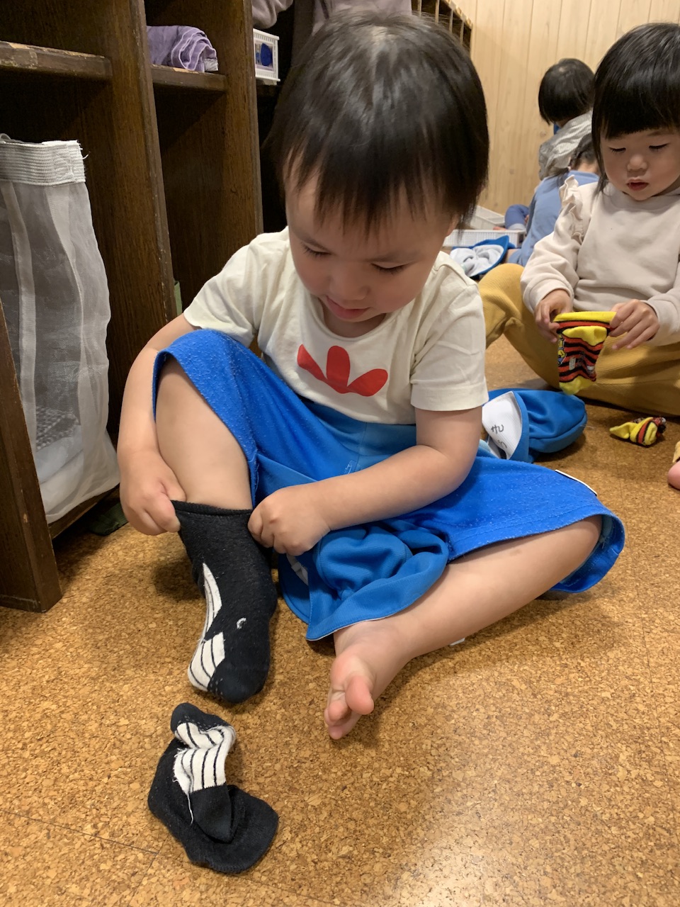 履き方が分からず、「できない!」と泣きながら訴えてくる子もいましたが、保育者が側に座って「ここを持てば履きやすいよ」などその都度実演と共に伝えると、少しずつ履き方のコツをつかみ、徐々に一人で履けるようになってきました。