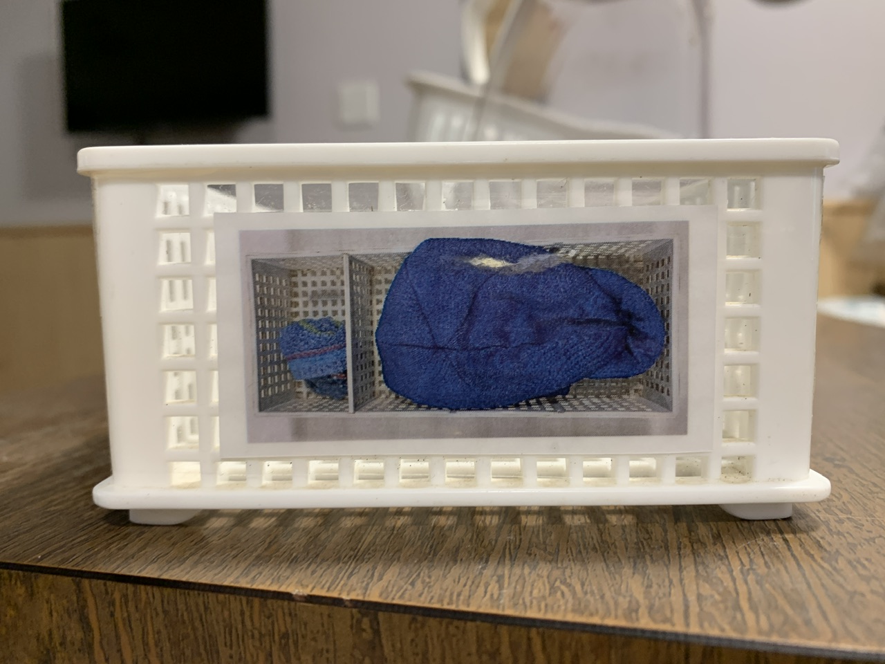 【子ども達が視覚的に分かりやすいよう、片付け方の写真を貼ったカゴ】