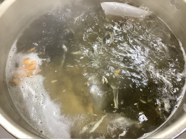 今日は昆布・鰹節・いりこの他に、取り除いた後の梅干しの種と離乳食で使用したかぼちゃの種からも出汁を取り、小松菜・もやし・木綿豆腐を煮込んでみそ汁を作りました。