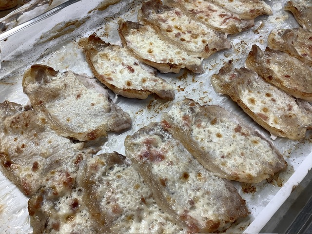 種を取り除いてたたいた梅干しと給食室手作りの豆乳マヨネーズを混ぜて作った「梅マヨ」を、豚肉に塗ってオーブンでカリッと焼き上げました。豚肉の脂と豆乳マヨネーズのコクがありながらも、梅干しの酸味が爽やかに感じられます。