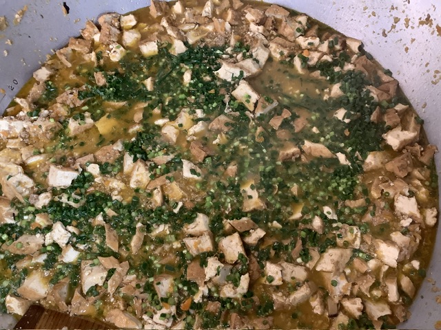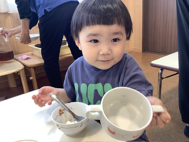 一真の合挽肉、厚揚げ、玉ねぎ、にんじん、干し椎茸、ニンニク、生姜が入りました。ごま油でニンニクと生姜を炒めるのですが、園庭に香ばしい香りが!外遊びをしていたこども達が、「いい匂いがする〜」「今日のごはんなんだろ〜」と給食室を覗きにきたほどでした。