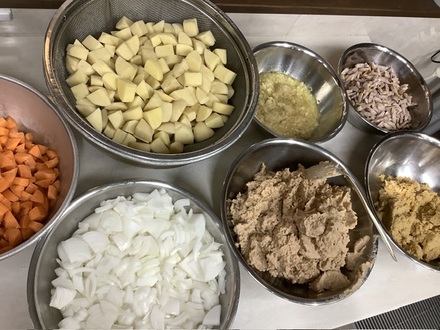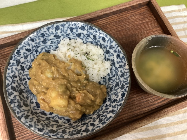 こども達にも大人気のカレー!今日は、大豆・ひよこ豆・グリンピースが入った豆々カレーを作りました。