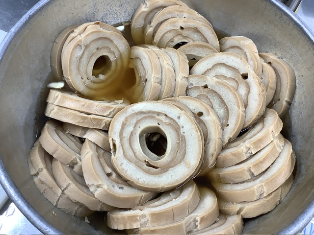 かつお昆布出汁に調味料で味をつけた調味液に車麩を浸し戻し、たっぷり含んだ車麩を軽く絞ります。