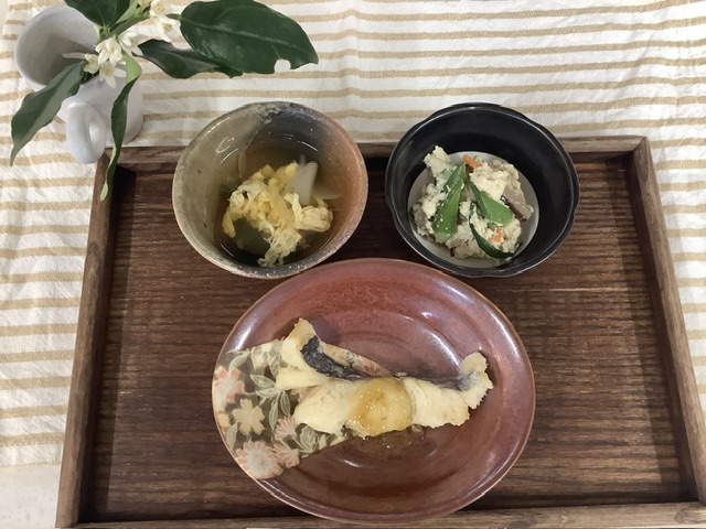 水切りをした木綿豆腐に、麦味噌・きび糖・濃口醤油・すりごま・ねりごまを混ぜて和え衣を作ります。具材にはおくら・にんじん・薄口醤油と味の母で煮含めた干ししいたけが入りました。