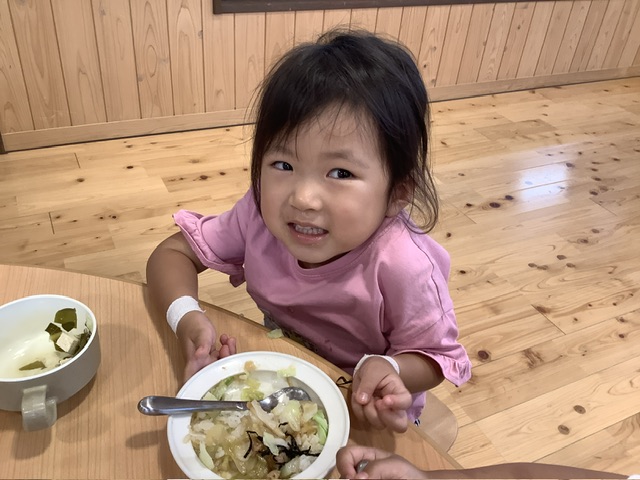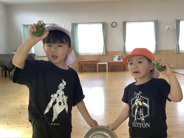 園庭に植えてあるピーマンが収穫時だったので、こども達に採ってもらいましたよ。塩昆布和えにして食べました。ピーマン苦手だけど、自分で採ったピーマンだからと頑張って食べる子の姿も!挑戦する気持ちが大事ですね♡