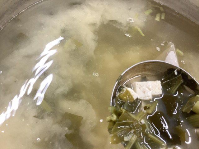 わかめ、木綿豆腐、35ファームの小松菜が入りました。梅干しの種を出汁として使いました。梅がほのかに香り、爽やかな味噌汁に仕上がりました。