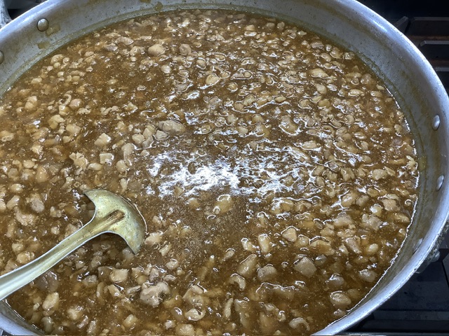 一真の鶏肉、35ファームの玉ねぎを、酒、きび糖、味の母、濃口醤油で煮詰めます。