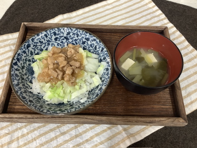 片栗粉でトロミをつけたら完成!ご飯の上に、千切りキャベツ、鶏肉をのせ、きざみのりをかけて出来上がりです。キャベツのシャキシャキした食感と、鶏肉の相性抜群。こども達もたくさんおかわりしてくれました。