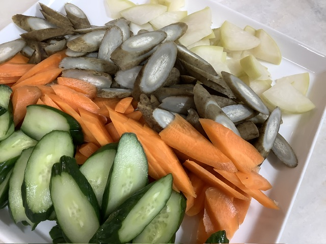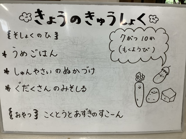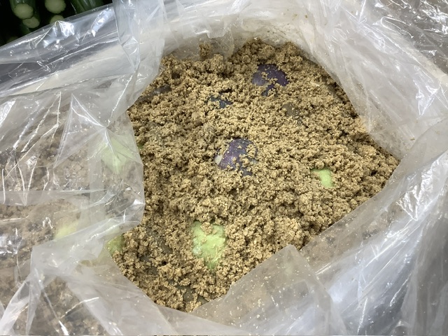 給食室で手入れをしているぬか床に、季節の旬野菜を漬けました。