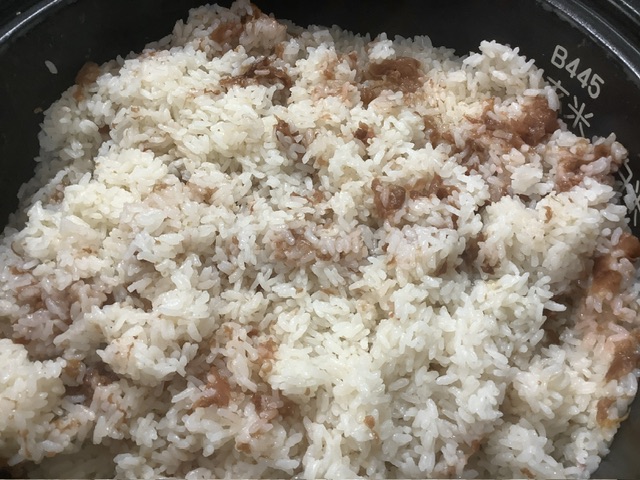 五分づき米に、薄口醤油・味の母・塩で味付けをした出汁、種を取り除いて叩いた梅干しを混ぜて炊きました。出汁は、昆布とかつお節から取っています。