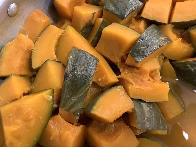 かぼちゃに、昆布とかつお節からとった出汁、きび、酒、味の母、薄口醤油で味付けしました。優しい味のかぼちゃの煮物は大人気でした。