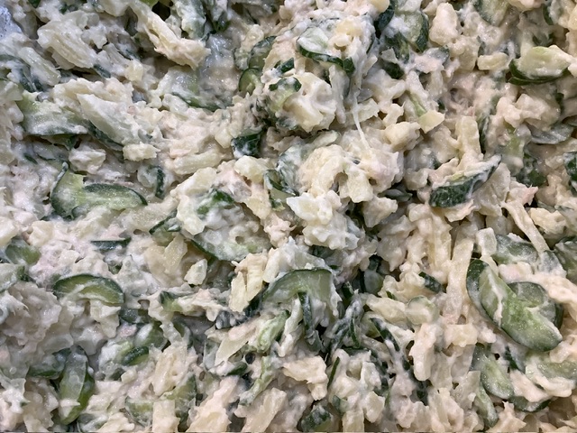 35ファームのきゅうりとじゃがいもを千切りにし、ツナと給食室手作りの豆乳マヨネーズで和えました。