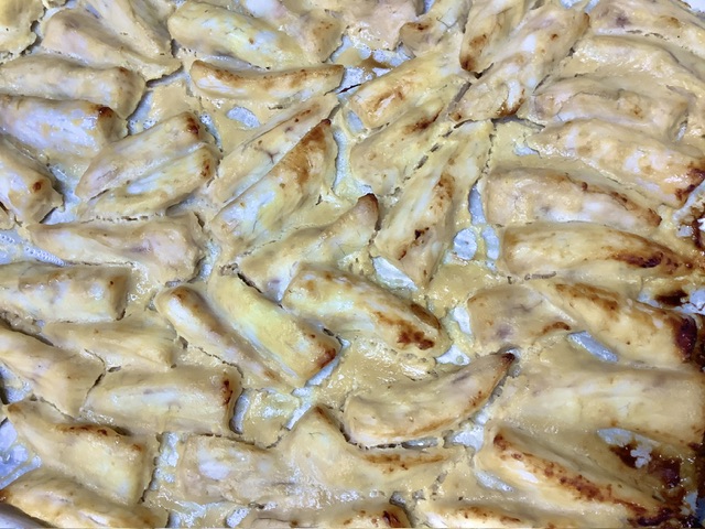 白みそ・きび糖・味の母・すりおろし生姜に天身を漬け込み、オーブンで焼き上げました。