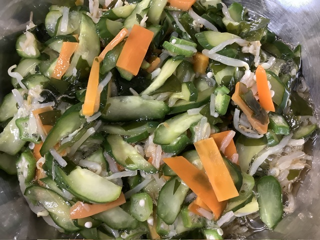オクラ、きゅうり、もやし、にんじん、ワカメがはいりました。甘酢でさっぱりと食べれます。